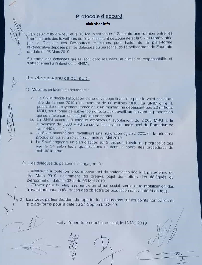 وقع ممثلو إدارة الشركة الوطنية للصناعة والمناجم "اسنيم" وثمانية من مناديب العمال اتفاقا يضع حدا للتصعيد الذي بدأه العمال قبل فترة، فيما رفض 6 من مناديب العمال التوقيع على الاتفاق.