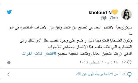 فقالت خلود :" سيكولوجية الانتحار الجماعي تفصح عن اتحاد وثيق بين الأطراف المنتحرهفي امر ما وكون الضحايا إناث فهذا دليل واضح على وجود خطب جلل أدى لذلك وإلى المأساويه التي تقف خلف هذا الانتحار الجماعي للأخوات أتمنى ان يتم التحقيق العادل وكشف الحقيقه للجميع"