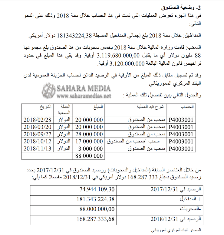 وقالت محكمة الحسابات في تقريرها الجديد إن وزارة الاقتصاد المالية (كان عليها آنذاك المختار ولد اجاي، المدير الحالي لشركة سنيم)، قامت خلال عام 2018 بخمس عمليات سحب من الصندوق، إذ سحبت 20 مليون دولار يوم 28 فبراير، وعادت لتسحب 20 مليون دولار أخرى يوم 20 مارس.