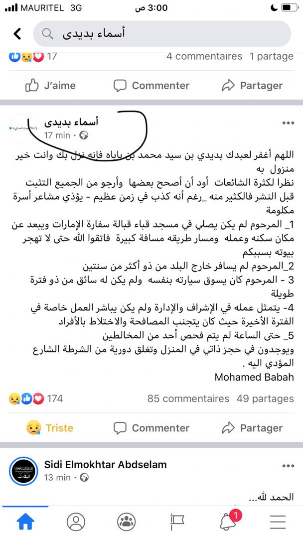 نفت الأخت أسماء بنت بديدي كريمة المغفور له بإذن الله تعالى / بديدي ولد باباه الذي انتقل الى جوار ربه مساء أمس بعد إصابته بمرض كوفيد 19.