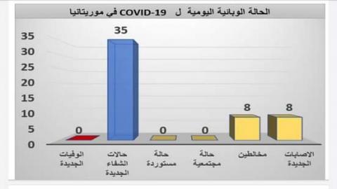 وقالت الوزارة في نشرتها اليومية إن 35 شخصا تعافوا من الفيروس فيما أصيب 8 أشخاص.
