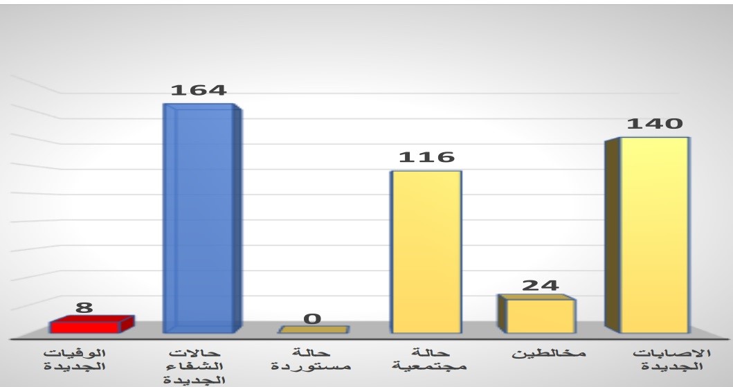 ووفق البيان فإن الحالات النشطة تصل حاليا 3428 بينها 61 حالة خطيرة و 93 حالة خفيفة و 3274 حالة بدون أعراض.