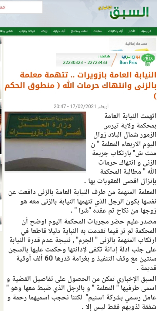 تتفاعل منذ بعض الوقت أحداث اتهام إحدى المعلمات في مدارس ازويرات بارتكاب جريمة الزنا مع رجل أجنبي ،حسب ادعاء النيابة العامة في الولاية ،لكن المعلمة تنفي تلك التهمة عن نفسها.