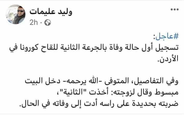 عندما عاد رجل أردني إلى منزله ،وأراد أن يبشر زوجته بأخذه الجرعة الثانية من لقاح كورونا ،زل لسانه ،وبدلا من أن يقول لها لقد أخذت الجرعة الثانية من اللقاح ،قال لها مبتسما : "لقد أخذت الثانية" مما جعلها تظن أنه تزوج عليها زوجة ثانية ،حيث أعمت الغيرة عينيها واستولى الغضب عليها فأخذت آلة حادة وضربته بها على الرأس ،فمات ،رحمه الله ،في الحال.