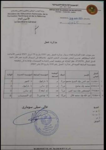 تسلمت مذكرة التكليف بتسيير اعدادية كامور اكتو بر 2019 بموحب تكليف من وزير التهذيب مالعينين ولد اييه قبل ان تكون ثانوية وبها مراقب عام وثلاثة اساتذة رسميين وبها ثمانية اقسام تربوية لم اتغيب يوما عن عملى واحرص على اداء مهامى بأخلاص قادما من اعدادية بكل بولاية كوركل