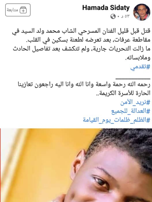 قتل قبل قليل الفنان المسرحي الشاب محمد ولد السيد في مقاطعة عرفات، بعد تعرضه لطعنة بسكين في القلب.ما زالت التحريات جارية، ولم تتكشف بعد تفاصيل الحادث وملابساته.