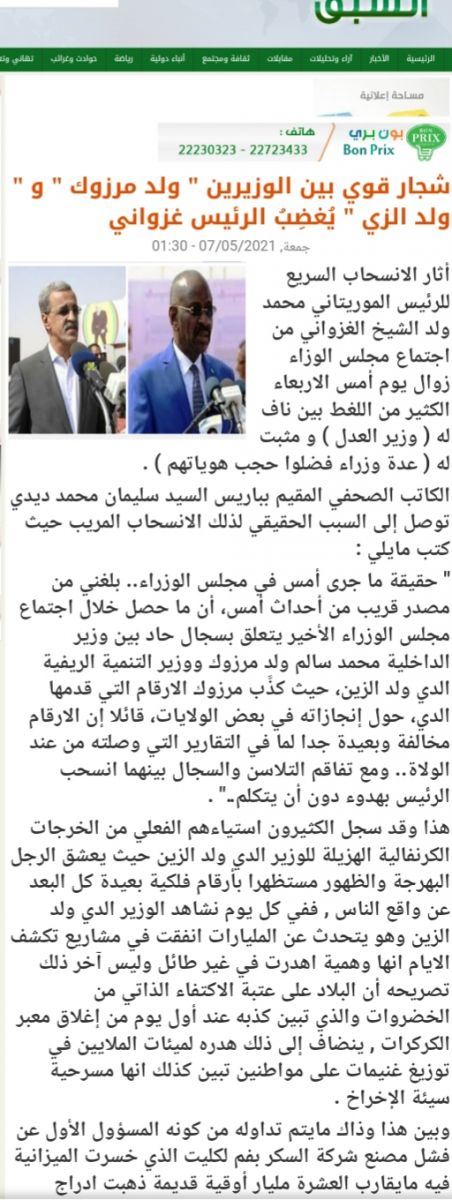 جاء في صحيفة "السبق الاخباري" نقلا عن مصادرها أن السبب وراء انسحاب الرئيس محمد ولد الشيخ الغزواني من مجلس الوزراء يوم الأربعاء الماضي كان على خلفية تلاسن حاد جرة بين وزير الداخلية مع وزير التنمية الريفية أثناء انعقاد المجلس برئاسة الرئيس غزواني.