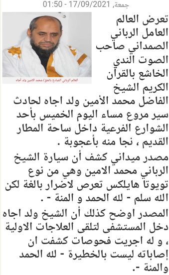 تعرض العالم الموريتاني المشهور/ محمد الأمين ولد اجاه لحادث سير قوي أثناء مروره بأحد الشوارع الفرعية في ساحة المطار القديم ،لكن الاصابات لم تكن خطيرة بفضل الله تعالى.