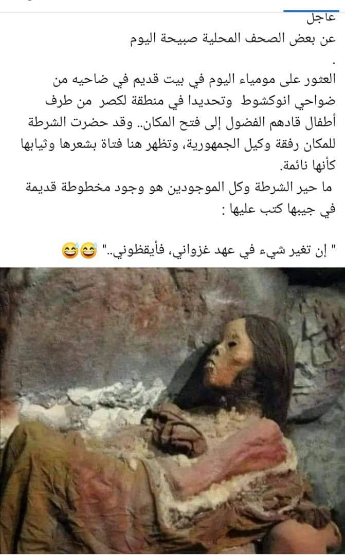 نشر احد المدونين خبر العثور على مومياء فتاة في مقاطعة لگصر بالعاصمة ،لكن ما يثير الشكوك حول مصداقية الخبر انه لم يتأكد من جهة مسؤولة ,وأن مسألة الرسالة التي وُجدت مع المومياء وفيها ذكر للرئيس غزواني أضفى عليها نوعا أشبه بالسخرية أو الدعابة.
