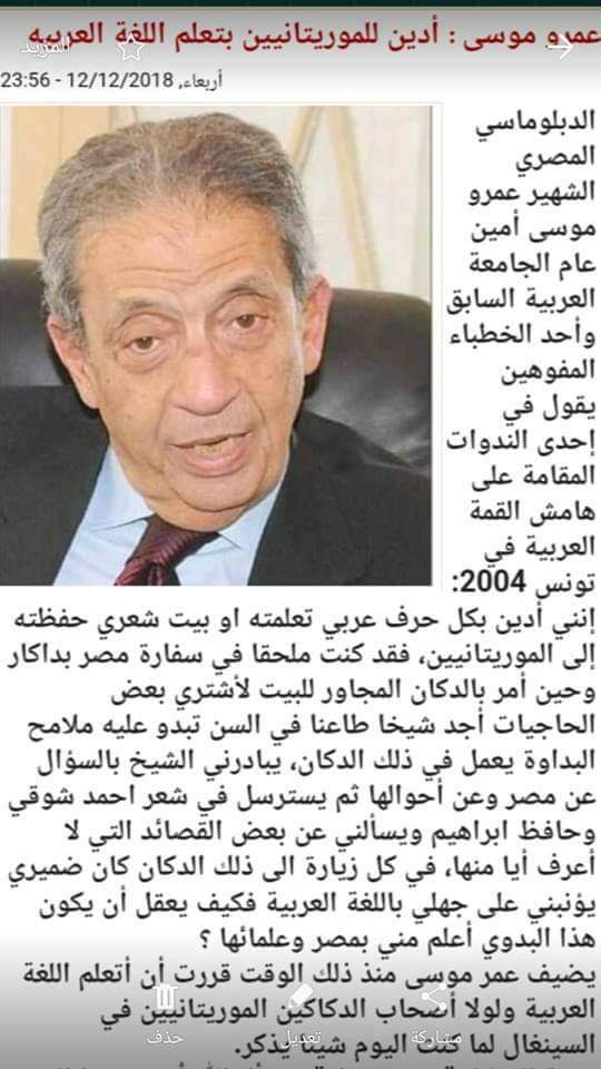 هذه إحدى الشهادات النادرة من رجل بوزن ومكانة الامين العام لجامعة الدول العربية السابق السيد عمر موسى تدل على أن الموريتانيين هم أسياد لغة الضاد قديما وحديثا في العالم العربي.