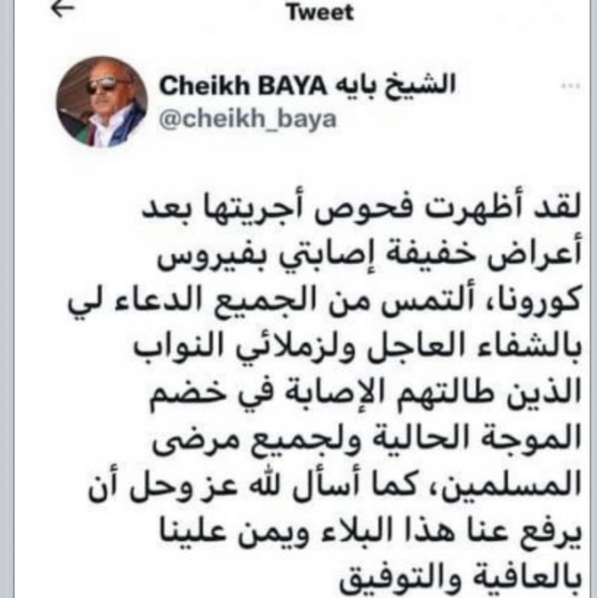 كشف رئيس الجمعية الوطنية الشيخ ولد بايه عن إصابته بفيروس كورونا، وأضاف ولد بايه في تغريدة نشرها اليوم الثلاثاء على تويتر كشف أنه يعاني "بعض الأعراض" وطالب الجميع بالدعاء له بالشفاء، وكشف ولد بايه في التغريدة ذاتها عن إصابة نواب في البرلمان بهذا الفيروس دون أن يذكر أسماءهم متمنيا لهم الشفاء ولجميع المواطنين الذين أصيبوا بهذا الفيروس.