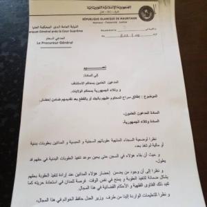 أصدر المدعي العام لدى المحكمة العليا القاضي/سيدي محمد ولد محمد الأمين تعميما الى المدعين العامين لدى دوائر الاستئناف ووكلاء الجمهورية ،يتعلق بالإفراج الفوري عن جميع المحكوم عليهم بالجلد أو القطع شريطة تقديمهم ضامن إحضار الى حين تنفيذ العقوبة في حقهم.