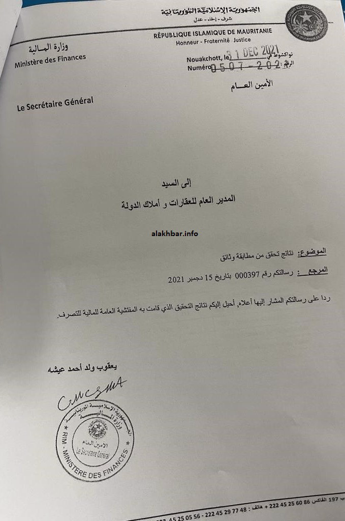 وتم منح نسخ من رخص هذه القطع الأرضية بناء على رسالتين جوابيتين من الأمين العام لوزارة المالية يعقوب ولد أحمد عيشه، كانت الأولى منها بتاريخ: 26 – 10 – 2021، ردا على رسالة من المدير العام لإدارة العقارات وأملاك الدولة بتاريخ 20 – 10 – 2021.أما الرسالة فكانت بتاريخ: 31 ديسمبر 2021، وجاءت ردا على رسالة من المدير العام لإدارة العقارات وأملاك الدولة بتاريخ 15 – 12 – 2021.
