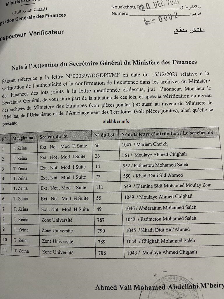 وكالة الأخبار حصلت على وثائق وتقارير رسمية تكشف تفاصيل هذه القضية، وتتبعت 21 قطعة أرضية آلت لأفراد من أسر محدودة ترتبط بمسؤولين بارزين أبرزهم أسرتي السفير الموريتاني في اليونسكو شيخنا ولد النني، والمستشار القانوني لوزير البترول والطاقة والمعادن شغالي محمد صالح.