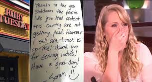جاءت بالطلبين وتناولاٰهما بنهم، وقبل أن يغادرا طلبا من النادلة الفاتورة. فعادت إليهما ومعها ورقة داخل المحفظة الخاصة بالفواتير كتبت فيها ما معناه: "دفعت فاتورتكما من حسابي الشخصي مراعاة لظروفكما. وهذا مبلغ مائة دولار هدية مني وهذا أقل شيء أقوم به تجاهكما. شكرا للطفكما. التوقيع سارة".