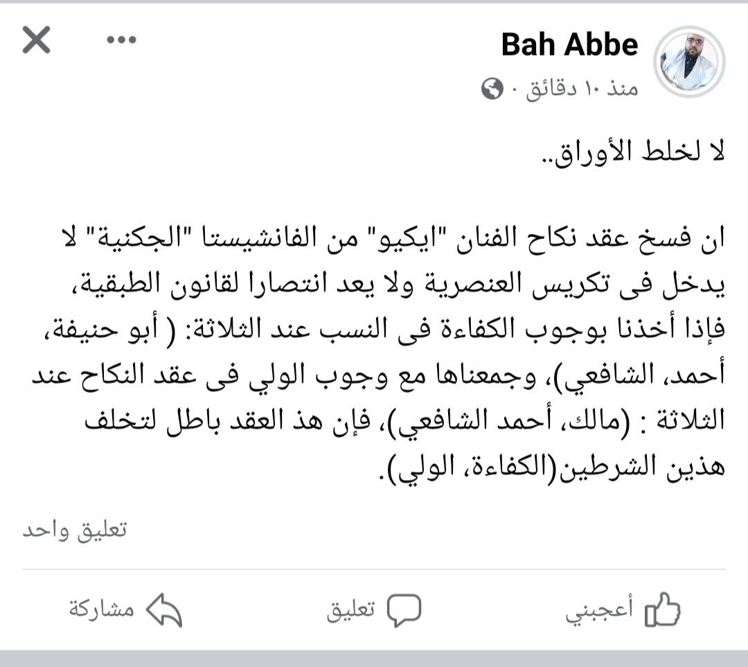 مصدر مطلع اوضح أن ولي الشابة " مامه منت المصطفى " طعن في الزواج من الأساس " معتبرا انه باطل نتيجة فقدان ركن أساسي من اركانه وهو " الولي " , زيادة على ما اعتبره وسطها الإجتماعي تجاوزا لمبدأ " الكفاءة" المنصوص عليها في بطون أمهات كتب الفقه المالكي .