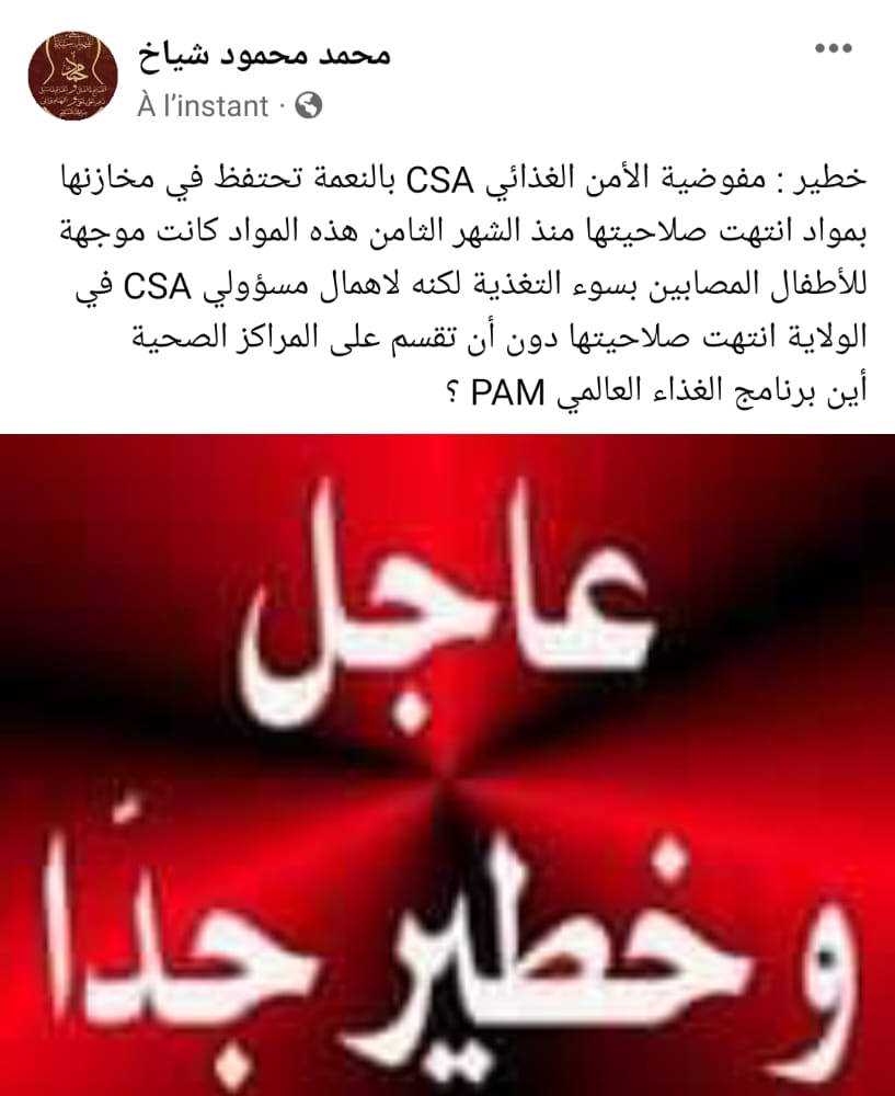 نشر الاعلامي المعروف محمد محمود شياخ المدير الناشر لصحيفة أنباء الشرق تدوينة على صفحته في الفيسبوك ،تضمنت فضيحة جديدة تتمثل في انتهاء صلاحية بعض المواد الغذائية في المخازن دون توزيعها على مستحقيها من الاطفال في ولاية الحوض الشرقي ،والذين هم في أمس الحاجة إليها.