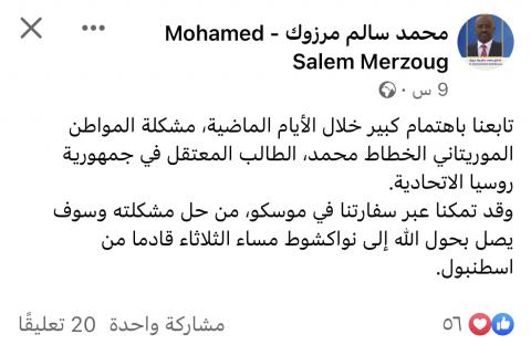 سفارة موريتانيا في موسكو، من حل مشكلته وسوف يصل إلى نواكشوط مساء الثلاثاء قادما من اسطنبول.