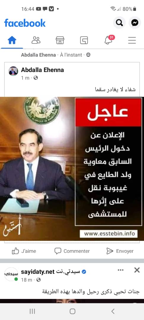 أعلنت مواقع وصفحات على مواقع التواصل الاجتماعي عن دخول الرئيس الاسبق/ معاوية ولد سيد أحمد الطايع في غيبوبة إثر وعكة صحية طارئة.