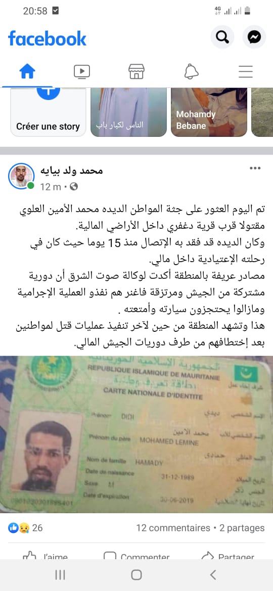من ناحية أخرى ،قتل شاب آخر بدم بارد من قبل جنود ماليين كالعادة ،بسبب عدم ردود فعل مناسبة من السلطات الموريتانية مع الاسف.