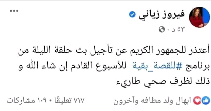 أما( عذر النواش) الذى ادلت به (فيروز زيانى ) وهو أن وعكة صحية ألمت بها ادت لتأجيل الحلقة ففيه( إن)