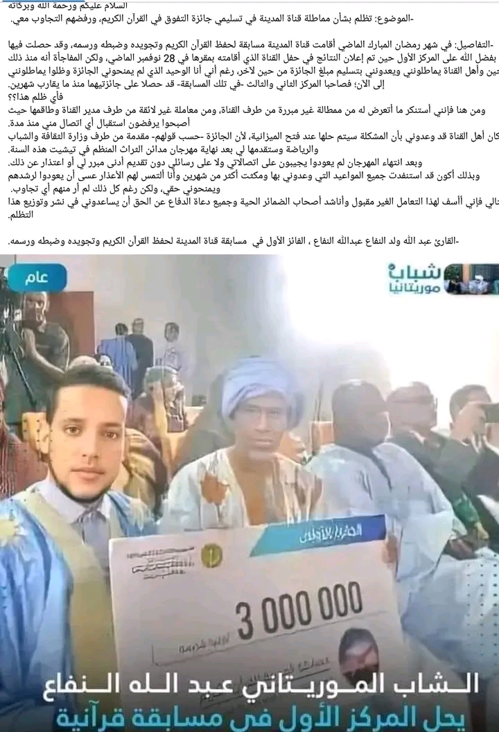حسبما ورد في تدوينة للقارئ عبد الله ولد النفاع الفائز الأول بجائزة حفظ وتجويد وضبط القرآن الكريم التي أجرتها ،،قناة المدينة،، في رمضان الماضي ،فإن القناة لا تزال ،حتى اللحظة ،تماطل في تسليمه جائزته رغم استلام أصحاب المراكز الأخرى لجوائزهم.