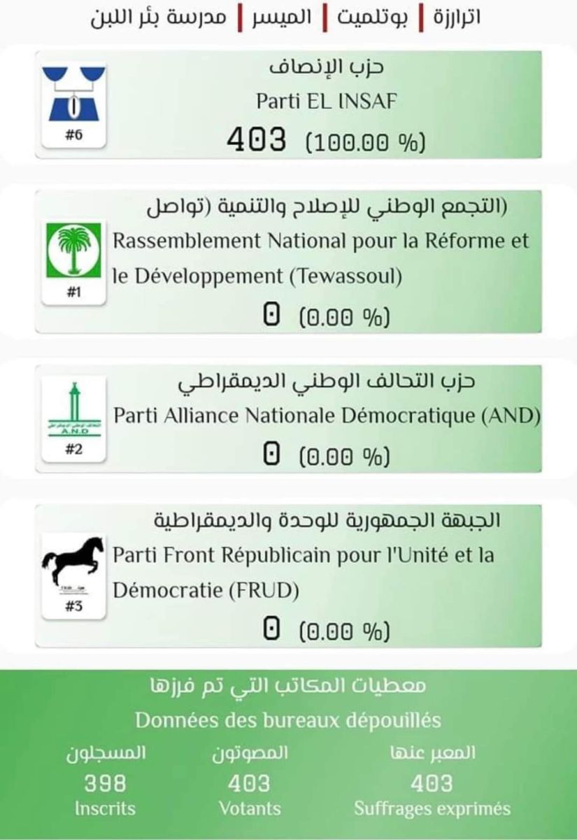 وبلغ عدد المصوتين في هذا المكتب 403، في حين أن عدد المسجلين فيه لا يتجاوز 398 وفقا لمعطيات اللجنة، ومنح كل المصوتين ثقتهم في البلدية، ونيابات مقاطعة بوتلميت، وجهة الترازرة، واللائحة الوطنية المختلطة لحزب الإنصاف.