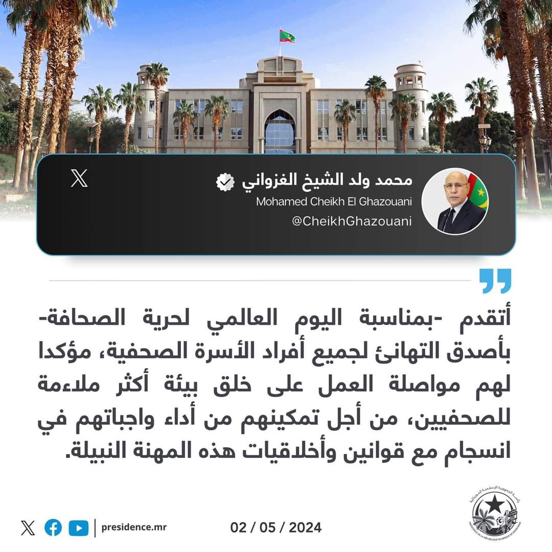 أعرب رئيس الجمهورية محمد ولد الشيخ الغزواني عن تهانئه لكافة منتسبي قطاع الصحافة في موريتانيا، بمناسبة اليوم العالمي لحرية الصحافة، الذي يصادف يوم 3 مايو من كل عام.