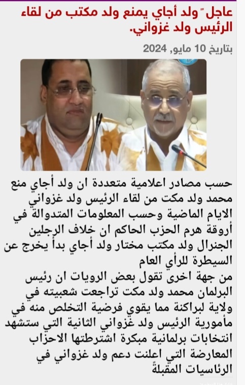 أفادت صحيفة ،،أخبار الوطن،، الإلكترونية أن مدير ديوان رئيس الجمهورية الوزير المختار ولد اجاي قد منع رئيس البرلمان الموريتاني الجنرال المتقاعد محمد ولد مكت من لقاء الرئيس محمد ولد الشيخ الغزواني ،الأمر الذي يوحي بخلافات كبيرة بين الرجلين اللذين ينتميان لولاية واحدة ويتمتعان بشعبية كبيرة فيها.