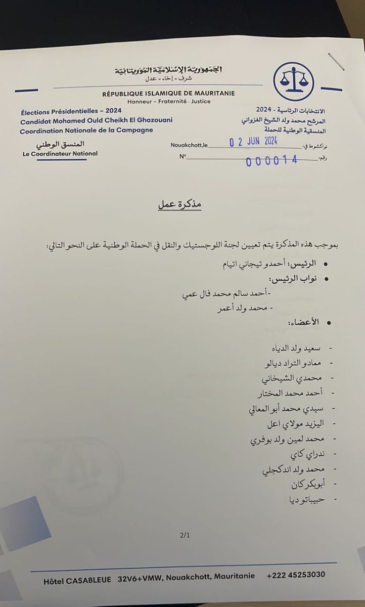 أصدرت حملة الرئيس محمد ولد الشيخ الغزواني قائمة بأسماء لجنة اللوجستيك والنقل.