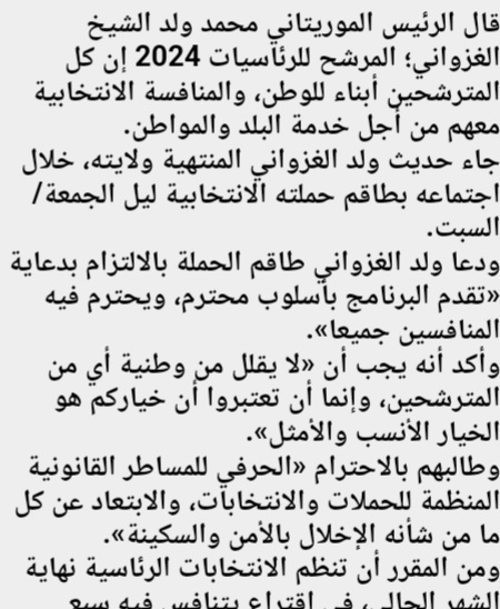 وجه رئيس الجمهورية المرشح محمد ولد الغزواني رسالة إلى طاقم حملته الانتخابية خلال اجتماعه بإحدى لجان الحملة مساء أمس ،عبر فيها عن رغبته في وجود حملة انتخابية تحترم المنافسين الآخرين لأنهم جميعا أبناء هذا الوطن.