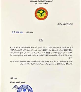 ترفع مديرية النقل بوزارة التجهيز والنقل ، إلى علم الجمهور أنه تطبيقا للمادة رقم 101 من المرسوم رقم 006-2007 الصادر بتاريخ 5 يناير 2007 والمحدد لإجراءات تطبيق الأمر القانوني رقم 047-2006 الصادر بتاريخ 06 دجمبر 2006 المتضمن قانون السير ، يجب على جميع ملاك الدراجات الغير مرقمة التوجه الى شبابيك مديرية النقل لاستكمال اجراءات ترقيمها ابتداء من صدور هذا البلاغ.