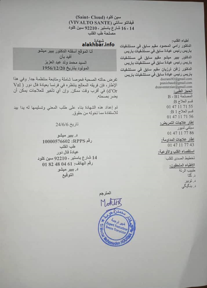 قال رئيس هيئة الدفاع عن الرئيس السابق محمد ولد عبد العزيز المحامي محمدن ولد اشدو إن حياة موكلهم في خطر، وإنه لا يستطيع الوقوف بسبب آلام وورم في أحد فخذيه.