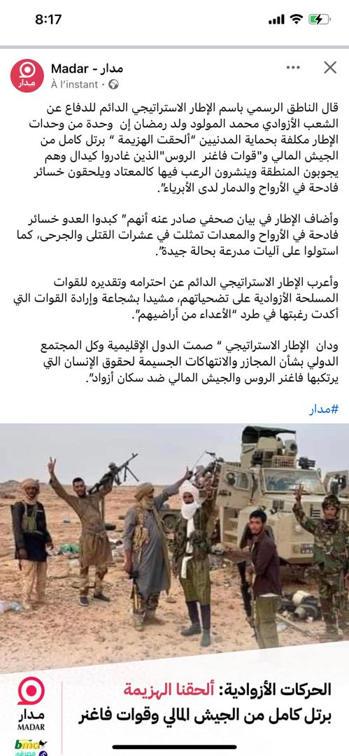 وأوضح أن "الوضع الحالي لا يزال بعيدا عن مرحلة المفاوضات أو الحلول السلمية، حيث أن المجلس العسكري هو من بدأ الحرب والصراع دون الالتزام باتفاقية الجزائر، مما فرض الحرب على الأزواديين".