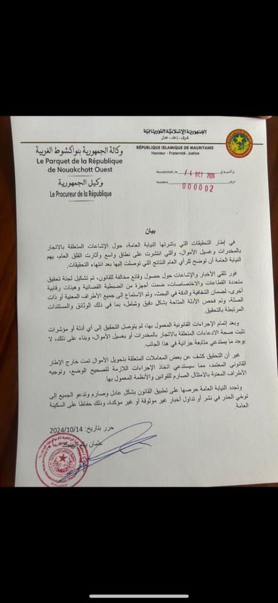 اعلنت النيابة العامة بمحكمة ولاية نواكشوط الغربية، أن نتائج التحقيق حول اشاعات الاتجار بالمخدرات وغسيل الأموال لم تتوصل إلى أي أدلة أو مؤشرات تثبت صحة الادعاءات المتعلقة بالاتجار بالمخدرات وغسيل الأموال.