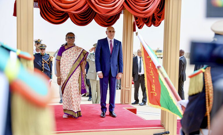 استقبل رئيس الجمهورية، رئيس الاتحاد الافريقي، السيد محمد ولد الشيخ الغزواني، اليوم الأربعاء عند سلم الطائرة بمطار نواكشوط الدولي”أم التونسي”، فخامة السيدة دروبادي مورمو، رئيسة جمهورية الهند، التي تقوم بزيارة صداقة وعمل لبلادنا تدوم يوما واحدا.