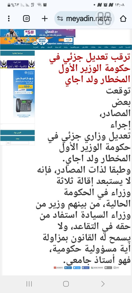 ذكرت مصادر اعلامية أن الرئيس محمد ولد الشيخ الغزواني قد يجري تغييرا جزئيا على حكومة الوزير الاول المختار ولد اجاي تشمل عدة حقائب مهمة ،وذلك لأسباب مختلفة ،منها ضعف الأداء.
