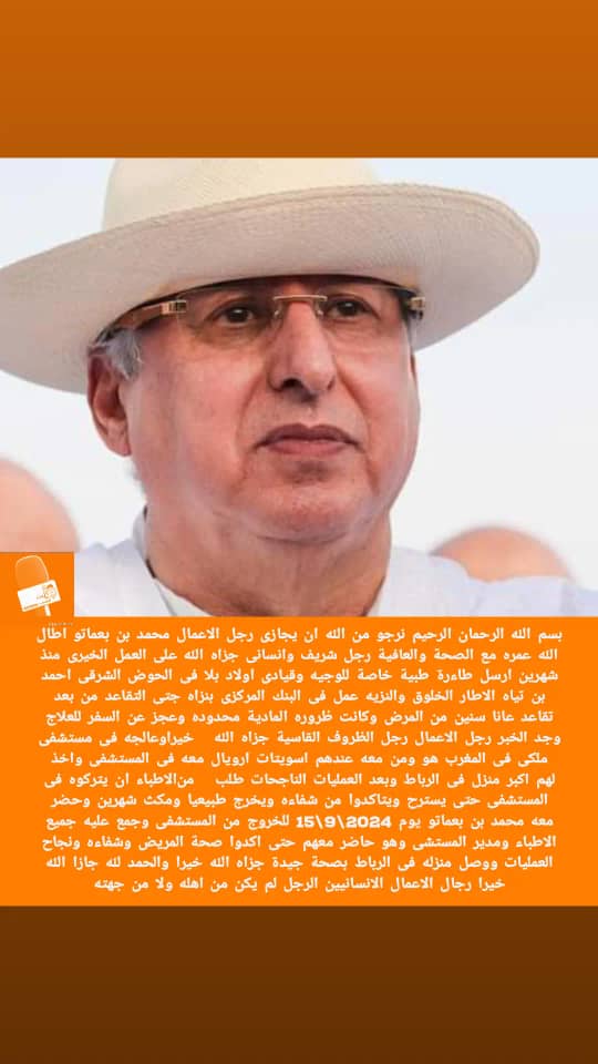 قام رجل الاعمال المعروف السيد/ محمد ولد بوعماتو بالتكفل بتكاليف علاج الاطار المتقاعد السيد/ أحمد ولد تياه بما في ذلك السفر والاقامة والرعاية الكاملة له ولمرافقيه.