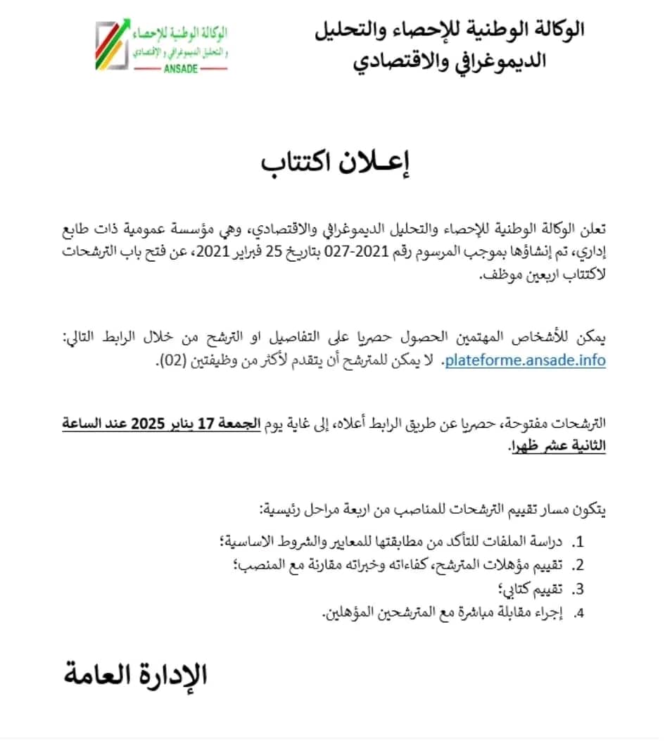 أعلنت الوكالة الوطنية للإحصاء والتحليل الديموغرافي والاقتصادي عن فتح باب الترشح لاكتتاب أربعين موظفًا، وفقًا للمرسوم رقم 2021-027 الصادر بتاريخ 25 فبراير 2021.