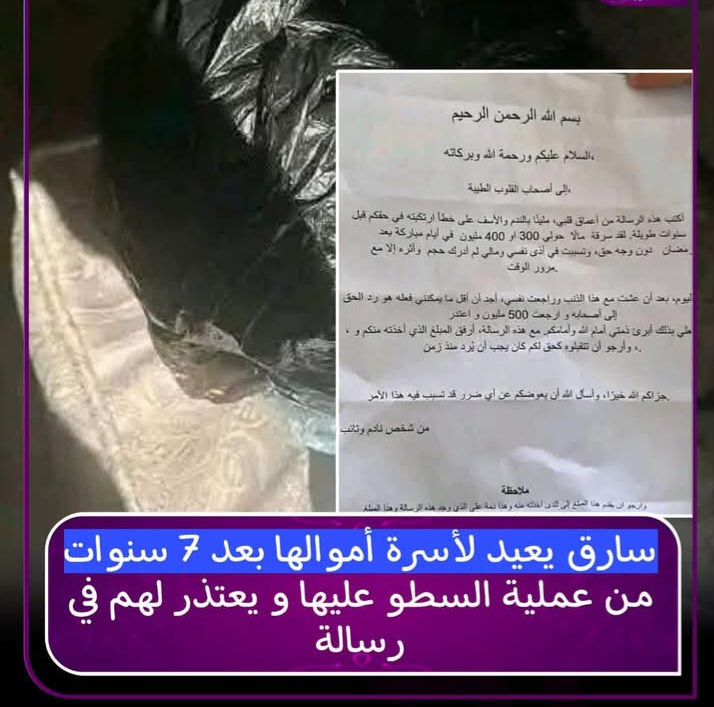حديث ينطبق على هذا اللص التائب الذي أعاد ما سلبه من أسرة قبل سبع سنوات إليهم مع رسالة اعتذار موقعة ب"التائب النادم.