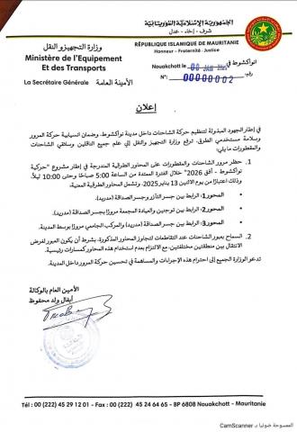 في إطار الجهود المبذولة لتنظيم حركة الشاحنات داخل مدينة نواكشوط، وضمان انسيابية حركة المرور وسلامة مستخدمي الطرق، ترفع وزارة التجهيز والنقل إلي علم جميع الناقلين وسائقي الشاحنات والمقطورات ما يلي: