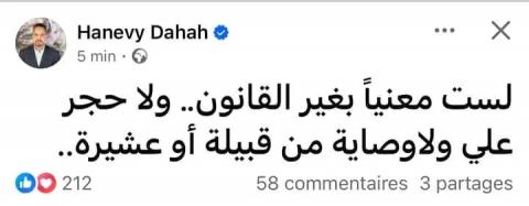 وأضاف في تدوينة على حسابه الشخصي بالفيسبوك، أنه ليس معنياً بغير القانون ..وألّا حَجْر عليه ولا وصاية من قبيلةٍ أو عشيرةٍ.