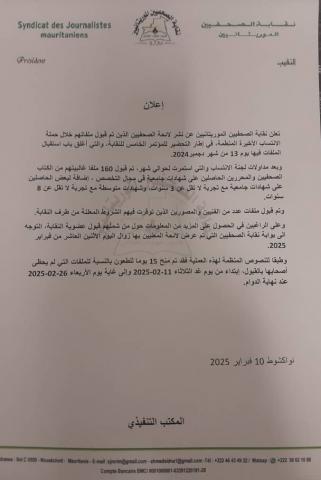 اعلنت نقابة الصحفيين الموريتانيين عن نشر لائحة الصحفيين الذين تم قبول ملفاتهم خلال حملة الانتساب في إطار التحضير للمؤتمر الخامس للنقابة، والتي أغلق باب استقبال الملفات فيها يوم 13 من شهر دجمبر 2024.